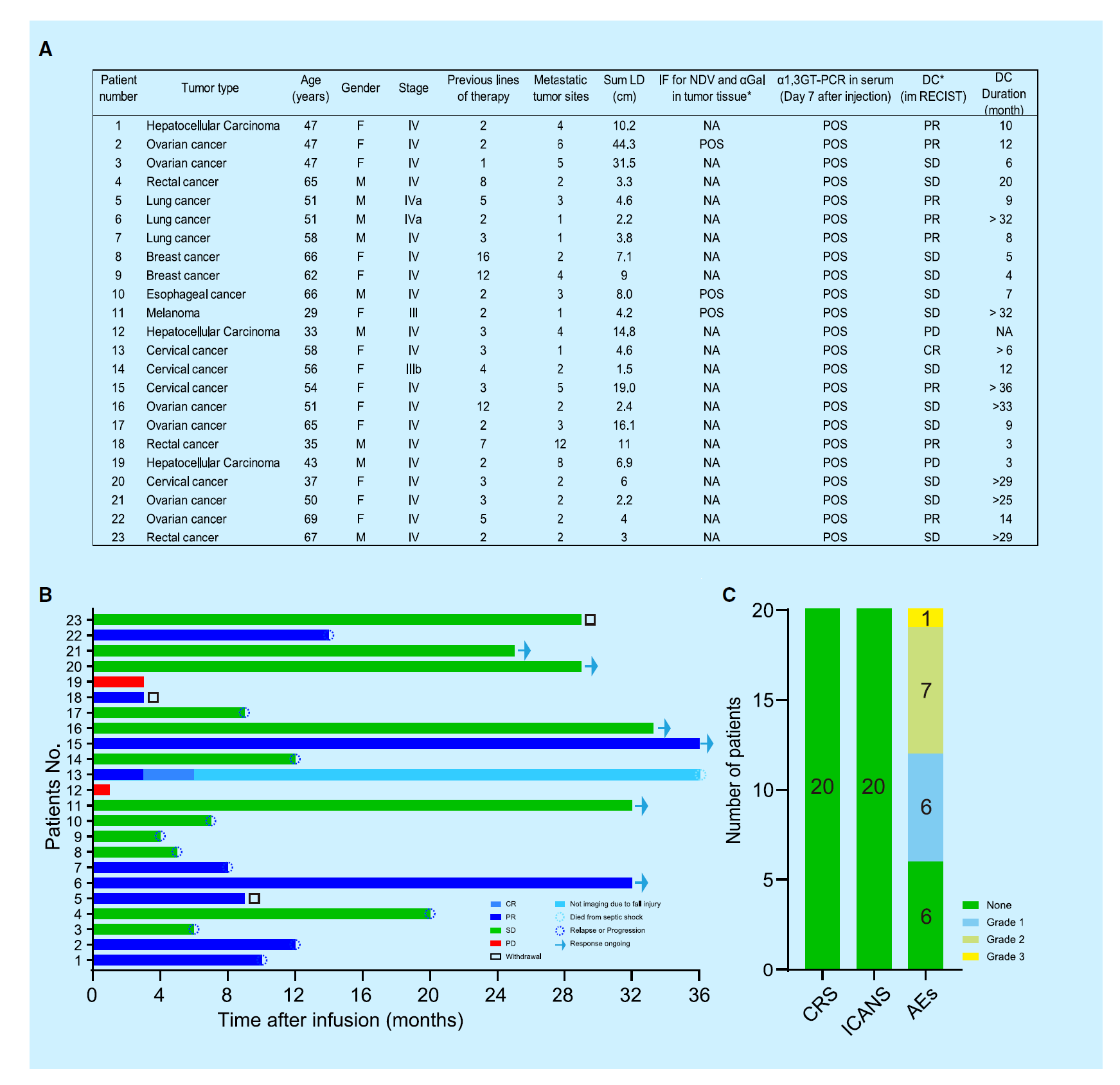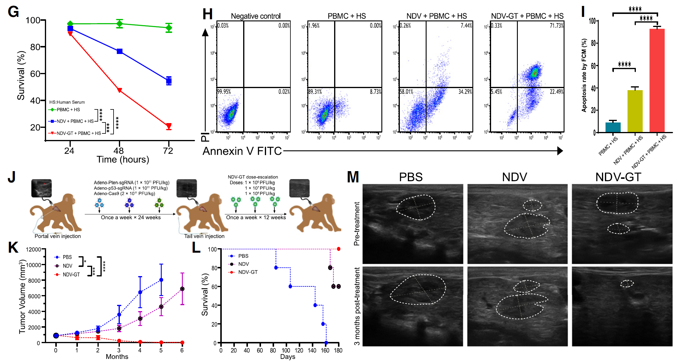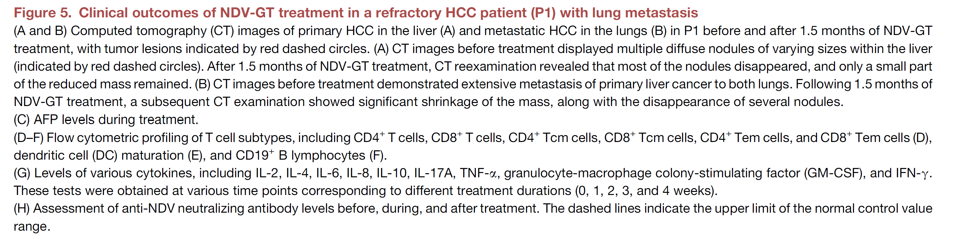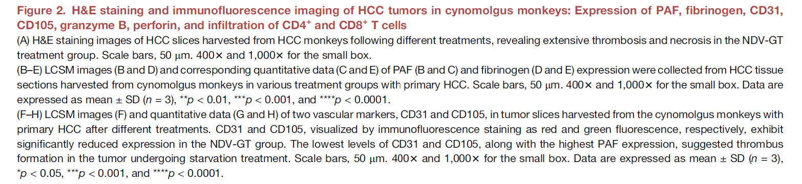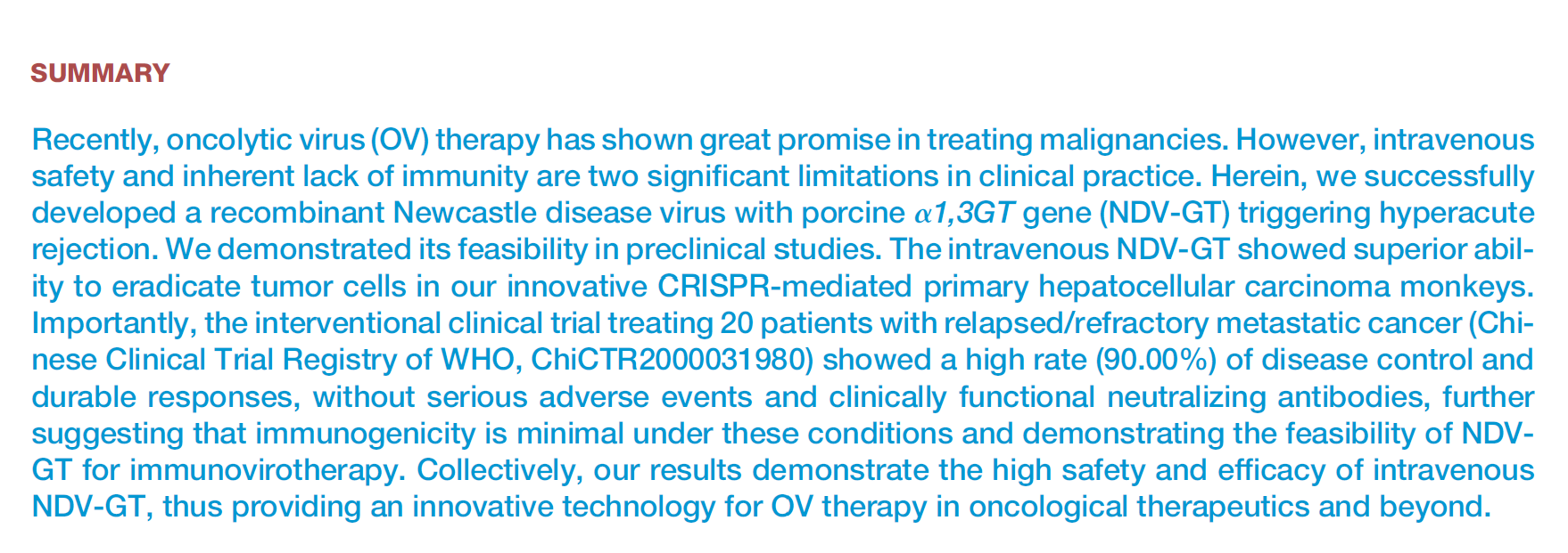 Preclinical studies using CRISPR-Cas9 technology in cynomolgus monkeys with primary hepatocellular carcinoma (HCC) confirmed the effectiveness of NDV-GT in inducing immune responses and inhibiting tumor growth. These findings were also extended to clinical trials involving patients with various advanced cancers, including HCC, ovarian cancer, rectal cancer, lung cancer, breast cancer, esophageal cancer, melanoma, and cervical cancer. In these trials, NDV-GT showed significant clinical benefits, demonstrating its potential for use as an anti-tumor therapy with strong translational potential for clinical applications in advanced cancer patients.