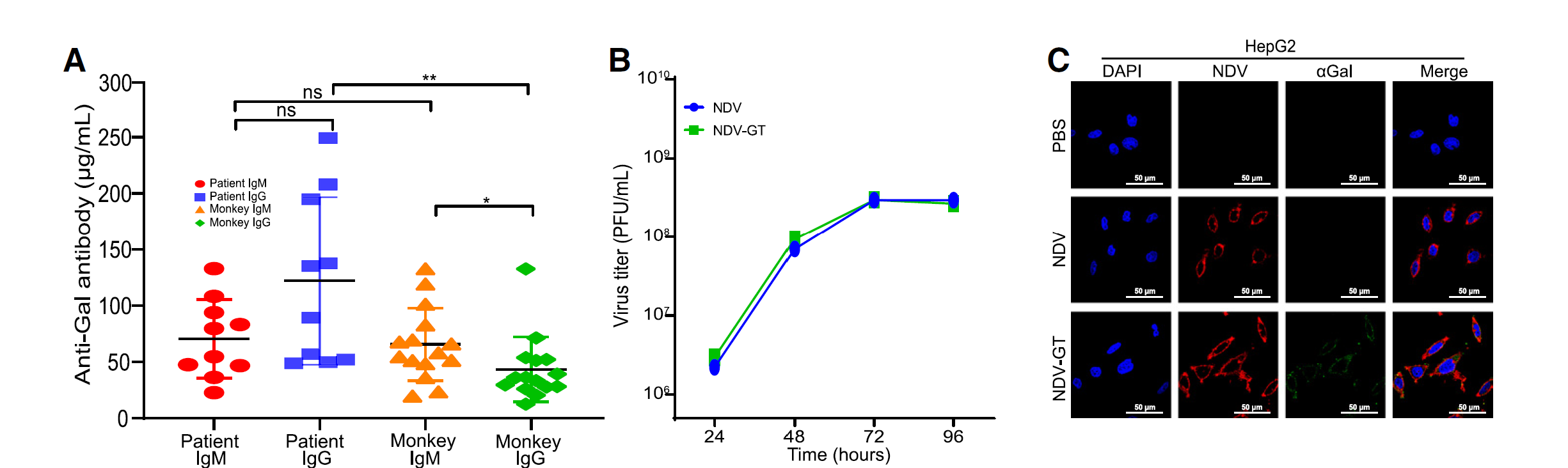 observed in the levels of anti-Gal IgM between patients and cynomolgus monkeys, while IgG levels were higher in patients than in monkeys (p < 0.01). There was no significant difference in anti-Gal IgG levels compared with IgM in patients (p > 0.05), but in cynomolgus monkeys, IgG levels were significantly lower than IgM (p < 0.05) (Figure 1A; Table S1).