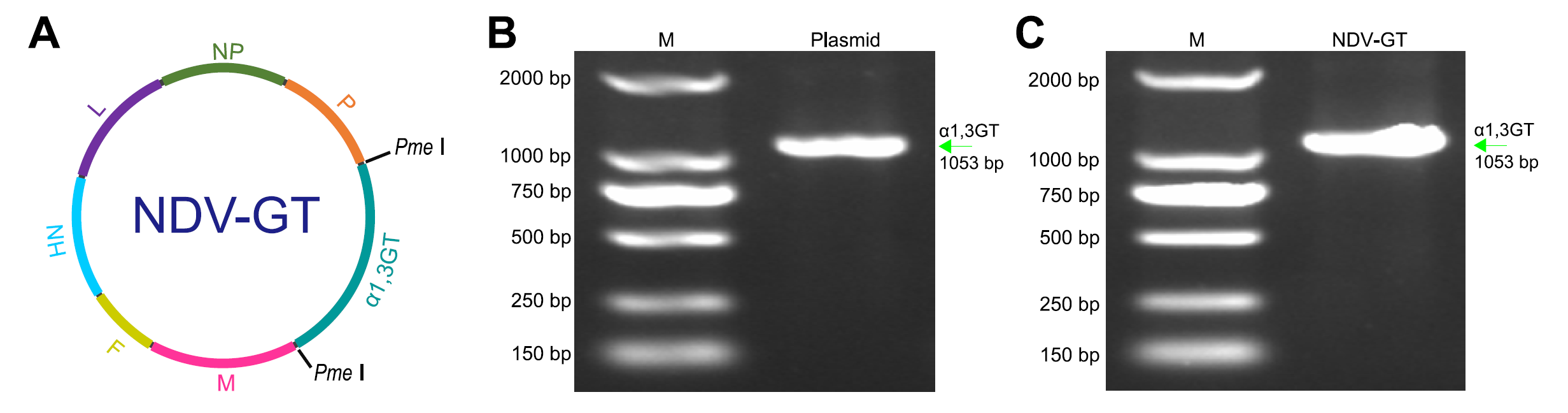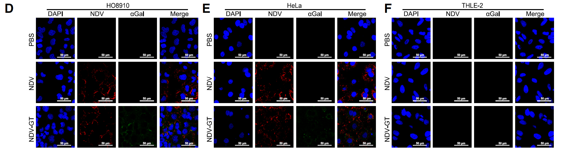 NDV-GT was created using reverse genetics, where the porcine a1,3GT gene was inserted into the NDV sequence. The successful insertion was confirmed by sequencing. The recombinant virus was tested in various cancer cell lines, including HepG2 (liver), HO8910 (ovarian), and HeLa (cervical) cells, showing efficient infection and expression of the a1,3GT gene. No infection was observed in normal liver cells (THLE-2), indicating specific targeting of tumor cells. NDV-GT demonstrated enhanced oncolytic effects compared to the parental NDV, with higher levels of apoptosis and around 90% inhibition in HepG2 cells. Similar results were observed in other cancer cell lines, suggesting the potential of NDV-GT as an effective therapeutic agent for cancer treatment.